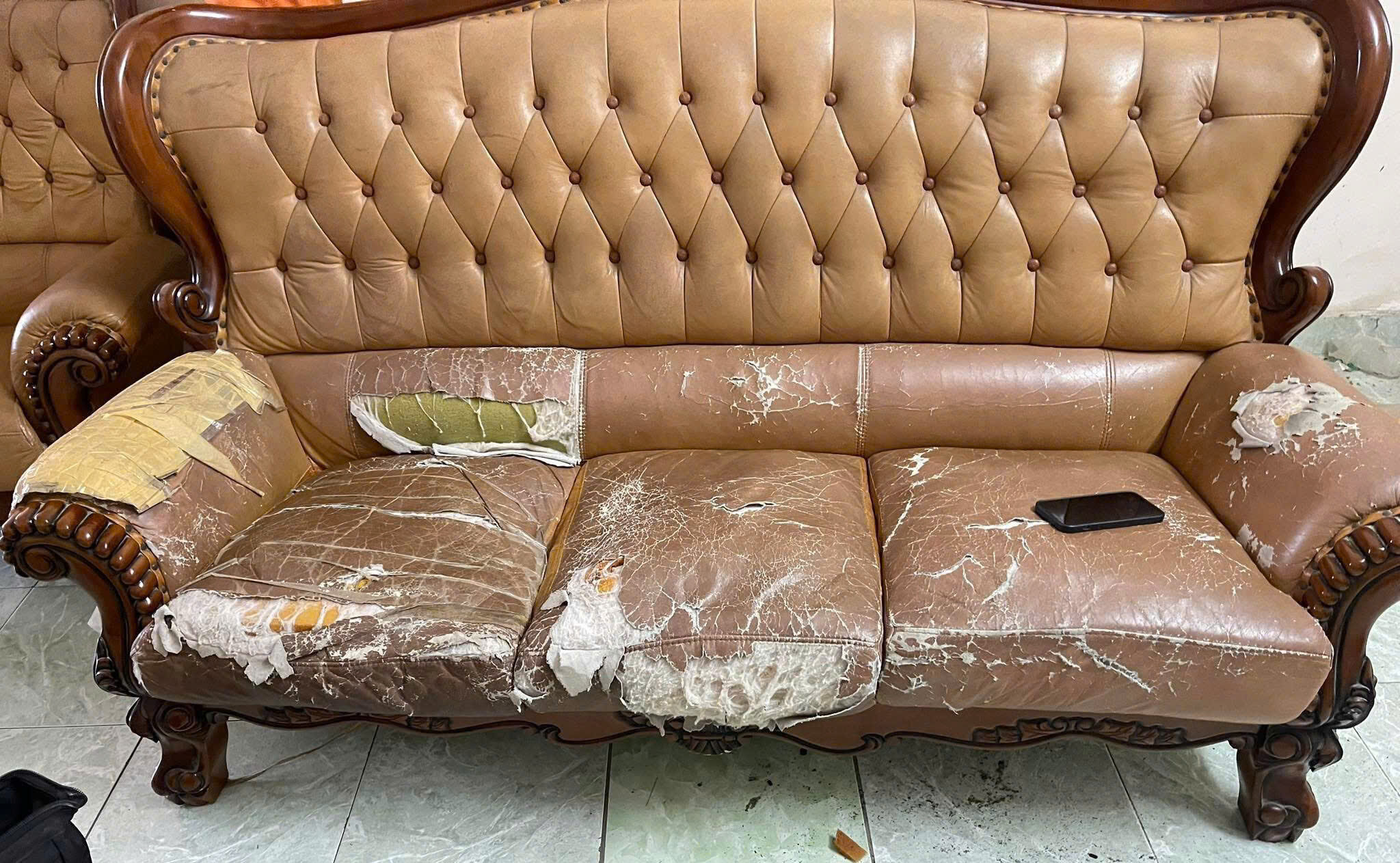 Bề mặt da cũ bong tróc, loang lổ từng mảng lớn, đặc biệt ở phần đệm ngồi – nơi sử dụng nhiều nhất. Không chỉ ảnh hưởng đến thẩm mỹ, tình trạng này còn khiến việc vệ sinh khó khăn và cảm giác ngồi không còn thoải mái.