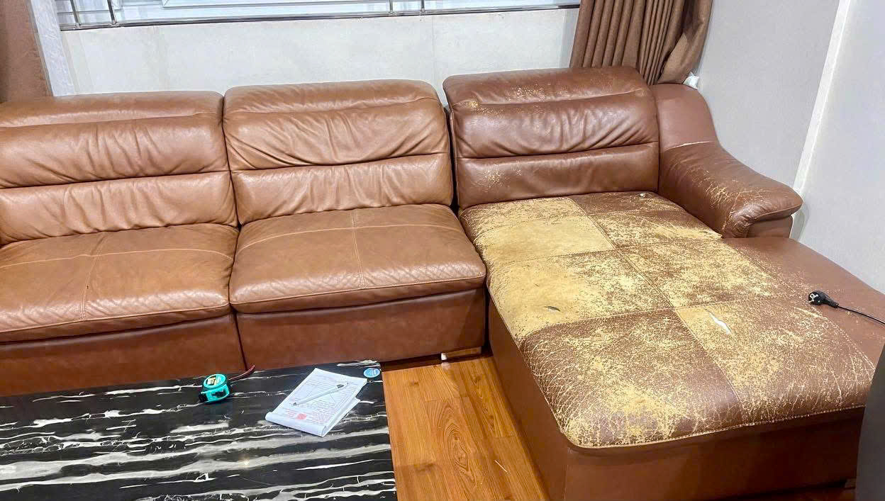 Sofa da sau một thời gian sử dụng thường khó tránh khỏi tình trạng bong tróc và bạc màu, đặc biệt với những bộ ghế đặt ở phòng khách – nơi có tần suất sử dụng cao mỗi ngày. Trường hợp bộ sofa tại Long Biên dưới đây là một ví dụ rất điển hình, khi bề mặt da đã xuống cấp rõ rệt nhưng phần khung ghế vẫn còn rất tốt.