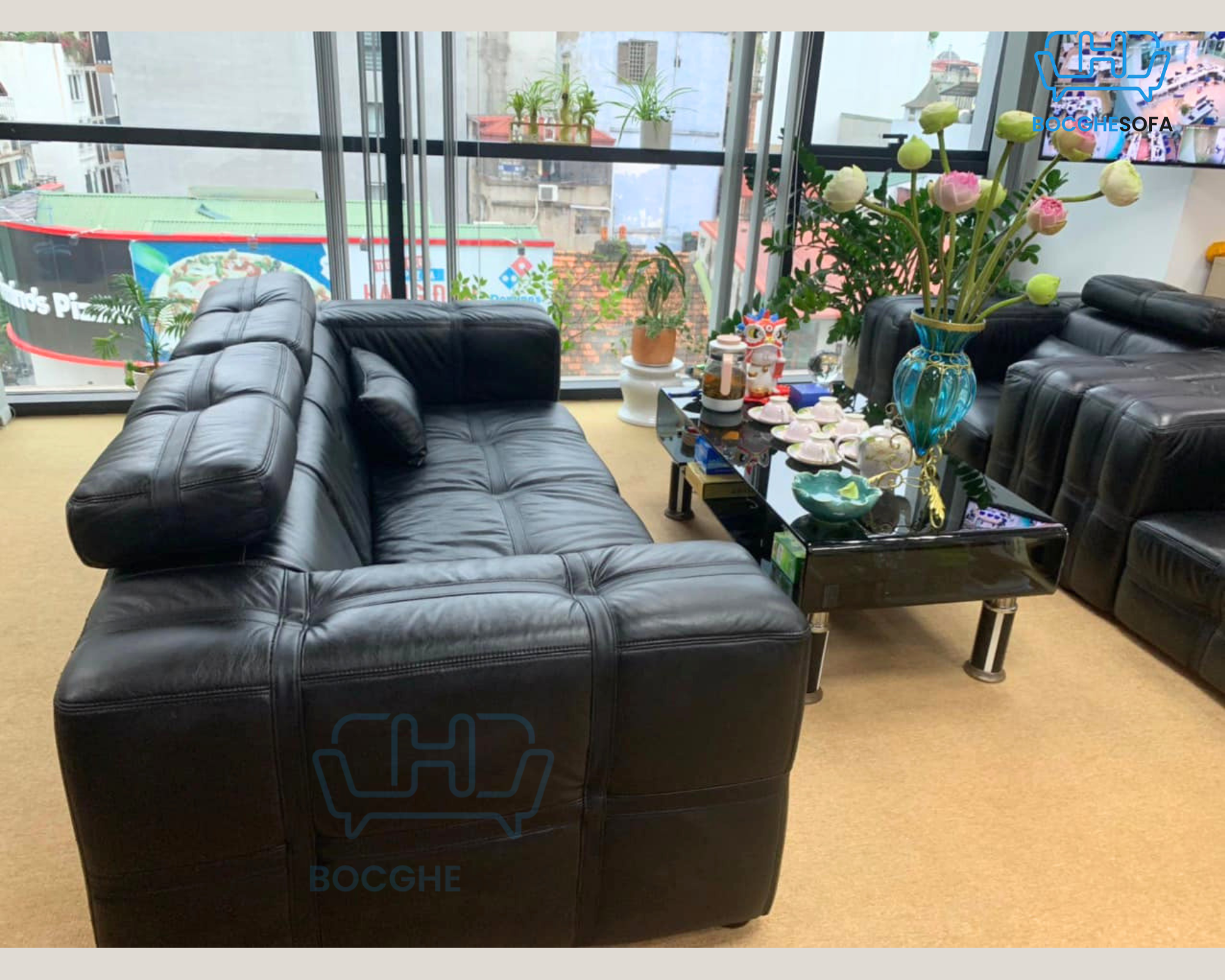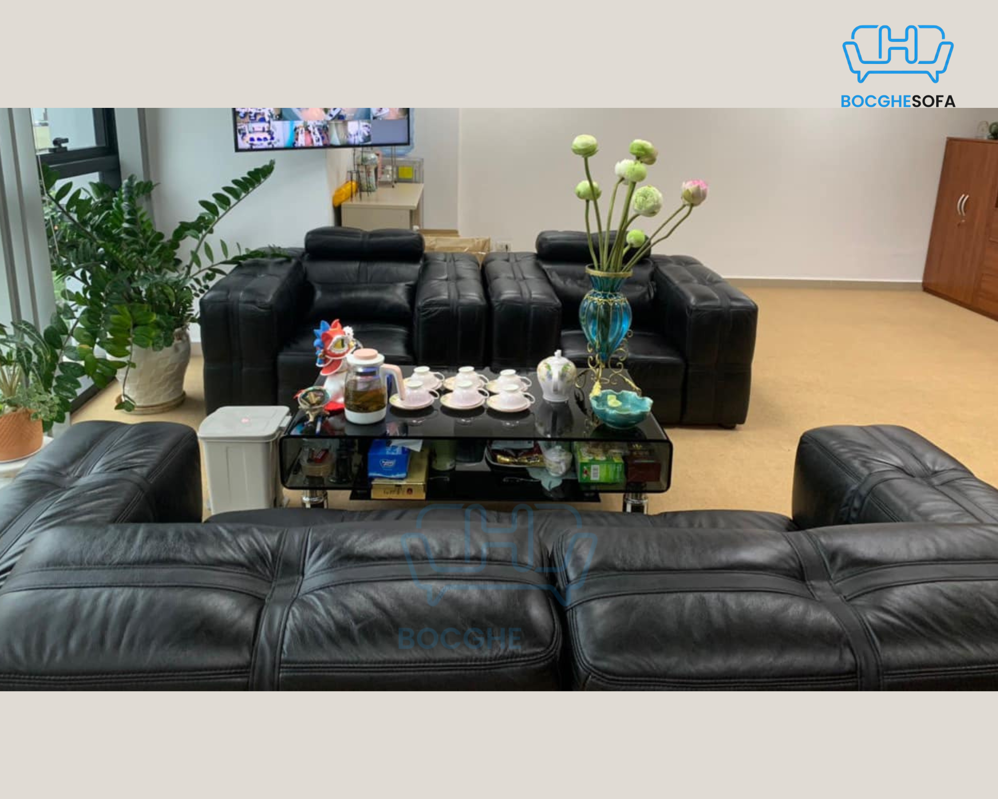 Sau khi khảo sát thực tế, Bocghesofa.com.vn đã tư vấn phương án sofa da màu đen kiểu dáng hiện đại, phù hợp hoàn toàn với môi trường làm việc.